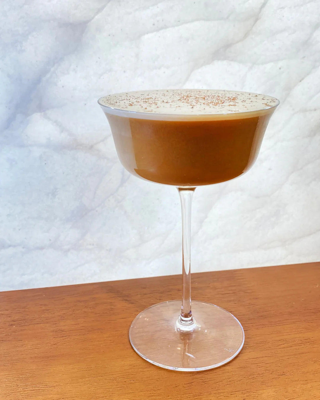 Serve: Combine ingredients into a cocktail shaker. Dry shake (without ice) vigorously. Add ice into your shaker and shake well. Double strain into a chilled coupe glass and garnish with freshly grated nutmeg.