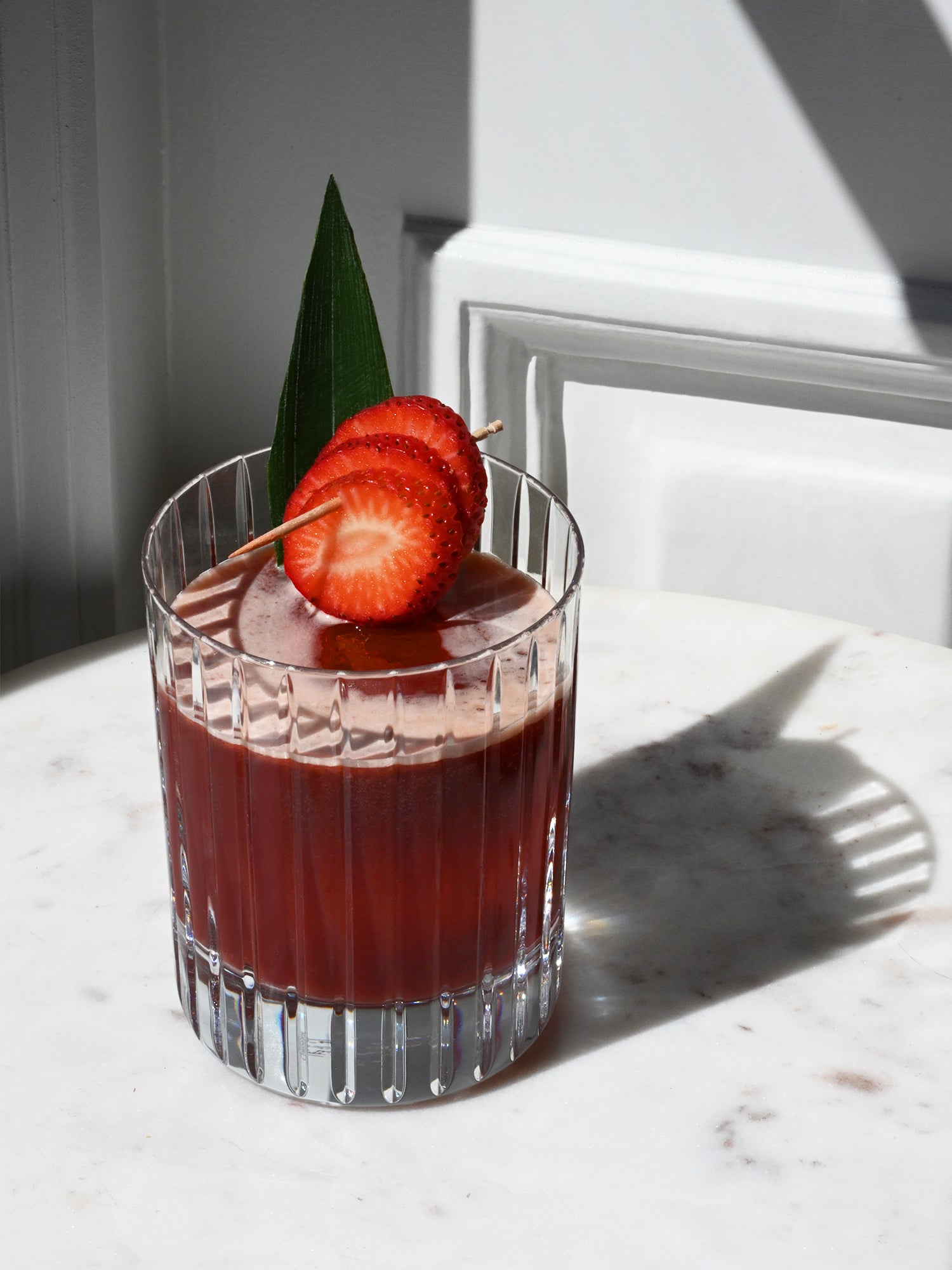 Serve: Combine ingredients (except ginger beer) into cocktail shaker. Add ice and shake. Double strain into a collins glass over ice. Top with ginger beer and garnish with a strawberry.